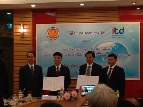 วันที่ 22 มีนาคม 2561 เวลา 10.00 น. ณ ห้องประชุม 1 สำนักงานคณะกรรมการการอาชีวศึกษา นายประจักษ์ ทาสี ผู้อำนวยการสถาบันการอาชีวศึกษาเกษตรภาคเหนือ และ ว่าที่ร้อยตรีอดิศักดิ์ แขดอน รองผู้อำนวยการสถาบัน เข้าร่วมพิธีลงนามบันทึกความตกลงระหว่าง สำนักงานคณะกรรมการการอาชีวศึกษากับสถาบันระหว่างประเทศเพื่อการค้าและการพัฒนา. ร่วมกันพัฒนาการอบรมอาชีพระยะสั้นและโครงการอาชีวศึกษาเพื่อชนบท (อศ. กช.)